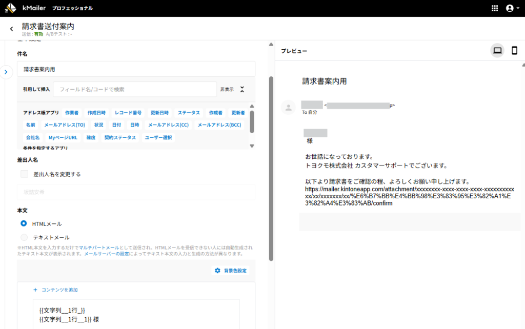 • 画面右側には、メールを受信した際を想定したプレビュー画面が表示されています。左側の入力画面に入力すると、リアルタイムにプレビューが表示されます。kintoneのフィールドに関しては、最新のフィールドの情報を引用してプレビューが表示されます。画面右側を操作することはできません。