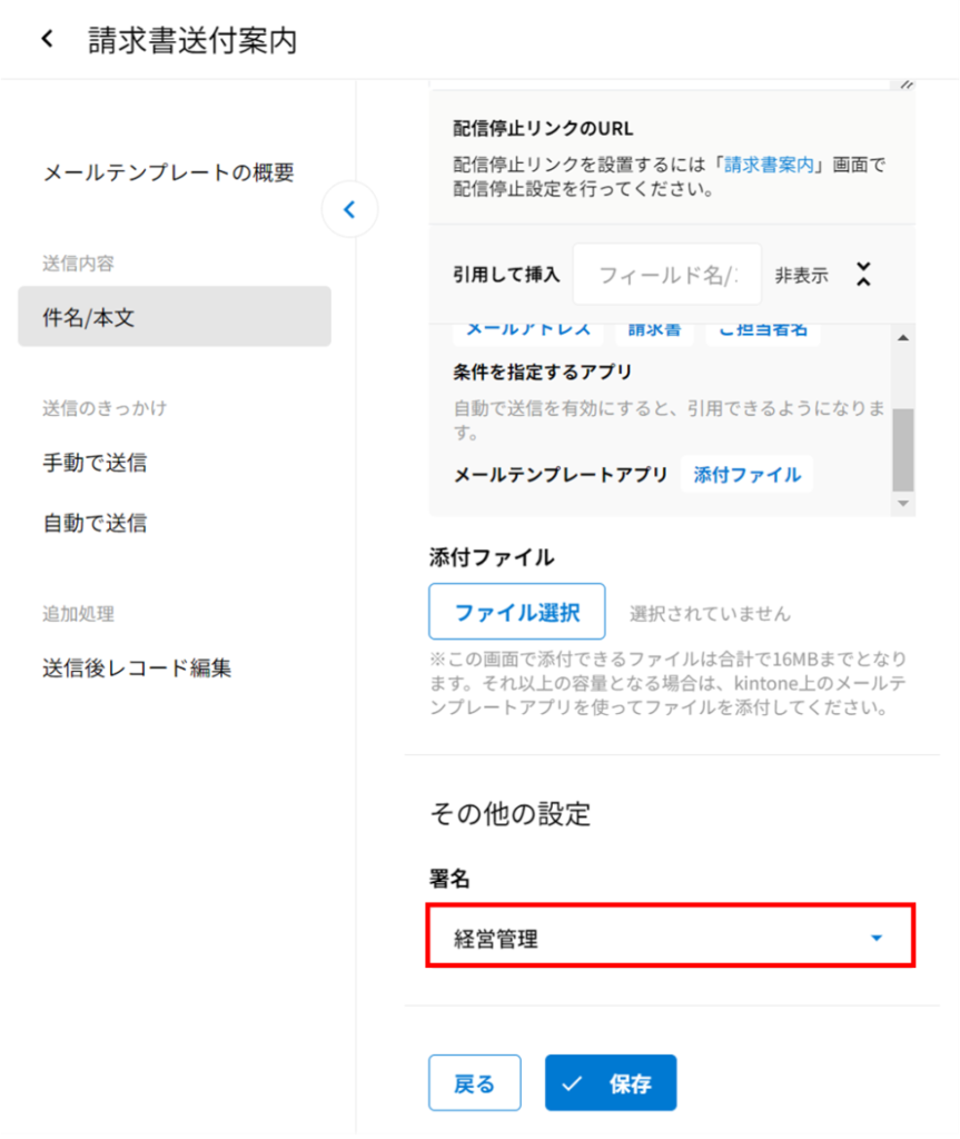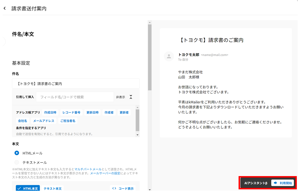 • 「件名」「本文」には、レコード内に入力された情報を引用することができます。