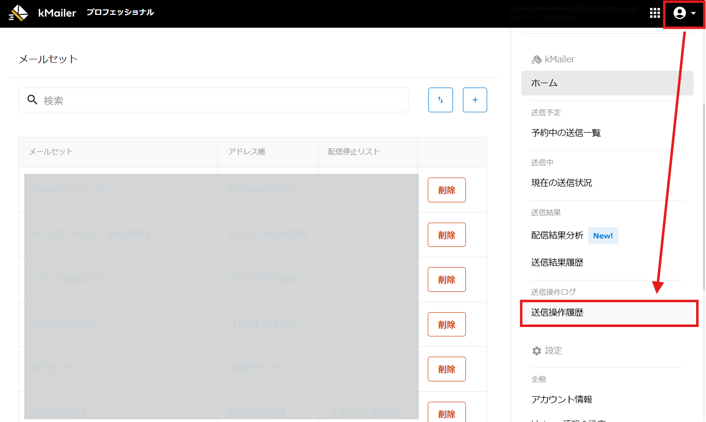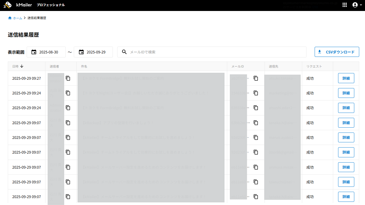 ホームkMailer 送信操作履歴を確認する 2021年11月18日2025年9月29日 SHARE ツイート シェア はてブ LINE Pocket 送信の操作を行ったメールが一覧表示されます。件名のリンクをクリックすることで、特定のメールに紐づく送信結果履歴を参照できます。 確認方法 1.kMailerにログインしている状態で、画面右上の丸いアイコンをクリックし、メニュー内の「送信結果履歴」をクリックします。 2. 送信依頼一覧を確認できます。 補足 ・「日時(送信操作の日時)」「送信者」「件名」「メールID」「送信先」「リクエスト(成功・失敗)」が確認できます。・件名をクリックすると、該当のメールの送信結果履歴を確認することができます。 コメントを残す コメントをキャンセルメールアドレスが公開されることはありません。 ※ が付いている欄は必須項目ですコメント ※ 名前 ※ メール ※ サイト 次回のコメントで使用するためブラウザーに自分の名前、メールアドレス、サイトを保存する。 Captcha * Type the text displayed above: