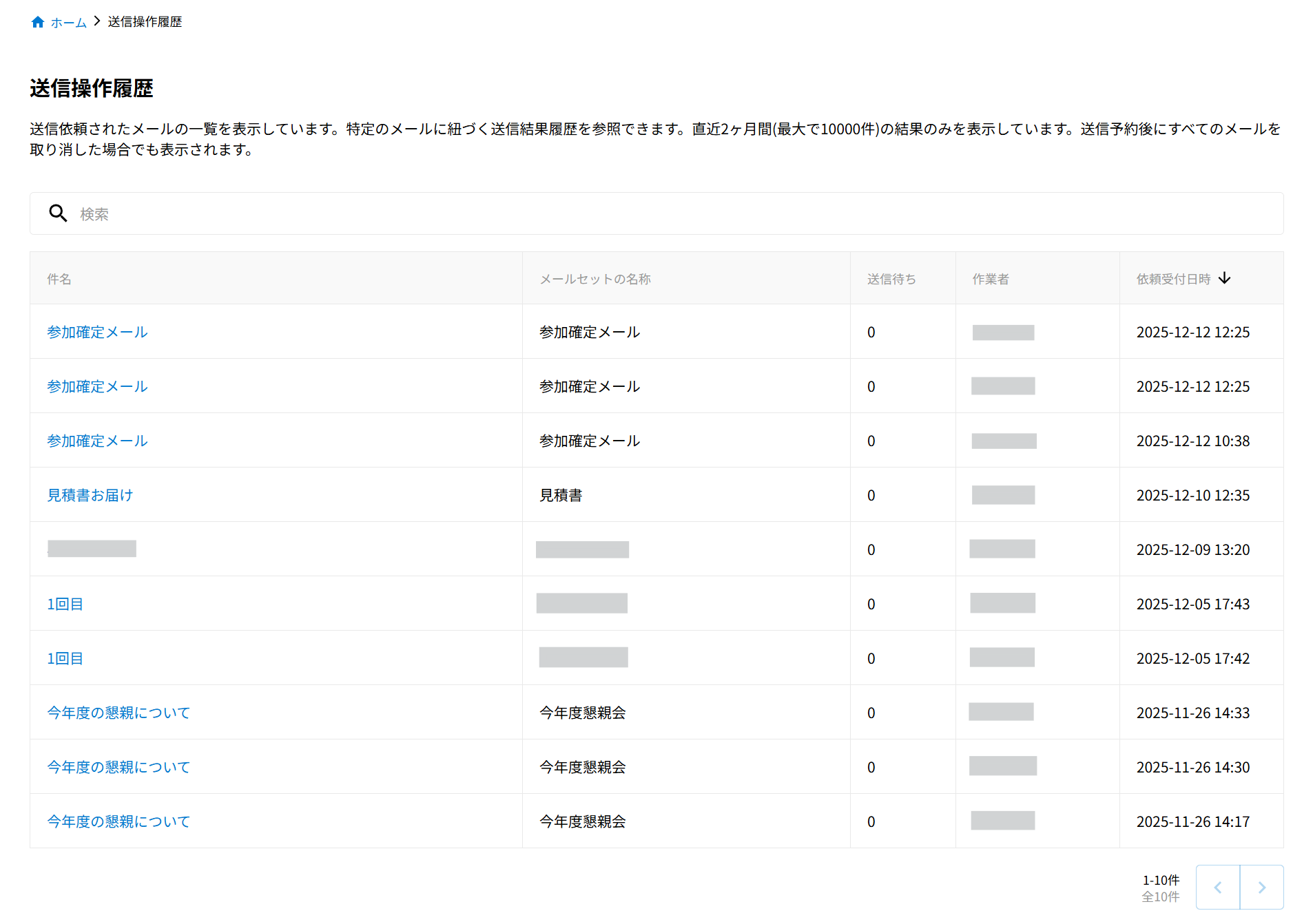 ホームkMailer 送信操作履歴を確認する 2021年11月18日2025年12月17日 SHARE ツイート シェア はてブ LINE Pocket 送信の操作を行ったメールが一覧表示されます。 確認方法 1.kMailerにログインしている状態で、画面右上の丸いアイコンをクリックし、メニュー内の「送信操作履歴」をクリックします。 2. 送信依頼一覧を確認できます。 補足 件名をクリックすると、該当のメールの送信結果履歴を確認することができます。 コメントを残す コメントをキャンセルメールアドレスが公開されることはありません。 ※ が付いている欄は必須項目ですコメント ※ 名前 ※ メール ※ サイト 次回のコメントで使用するためブラウザーに自分の名前、メールアドレス、サイトを保存する。 Captcha * Type the text displayed above: