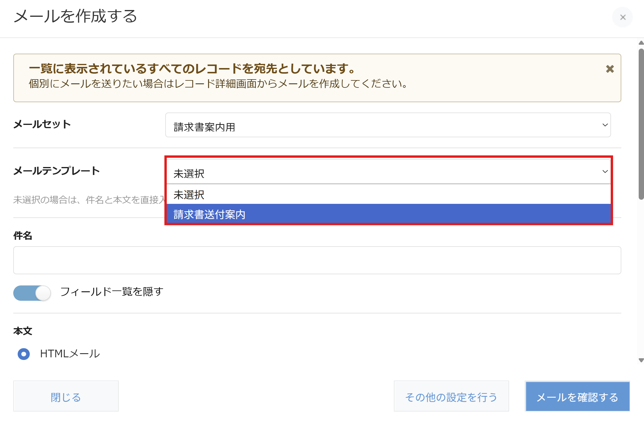 - 【2026年1月16日(金)】のバージョンアップにより、メールテンプレートを選択した時点で件名、本文が適用される仕様に変更となりました。