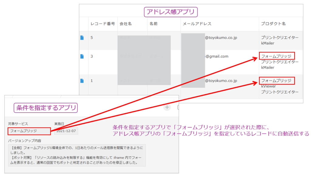 また、設定した条件になったときに、そのレコードに登録されているメールアドレスに送るほか、条件を設定するアプリと、宛先を指定するアプリを別にすることもできます。