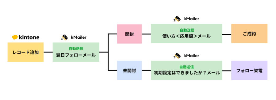 kMailerにて、時間経過とkintoneのデータの状態を組み合わせて、ストーリーに沿ってメールを送信できる機能です。