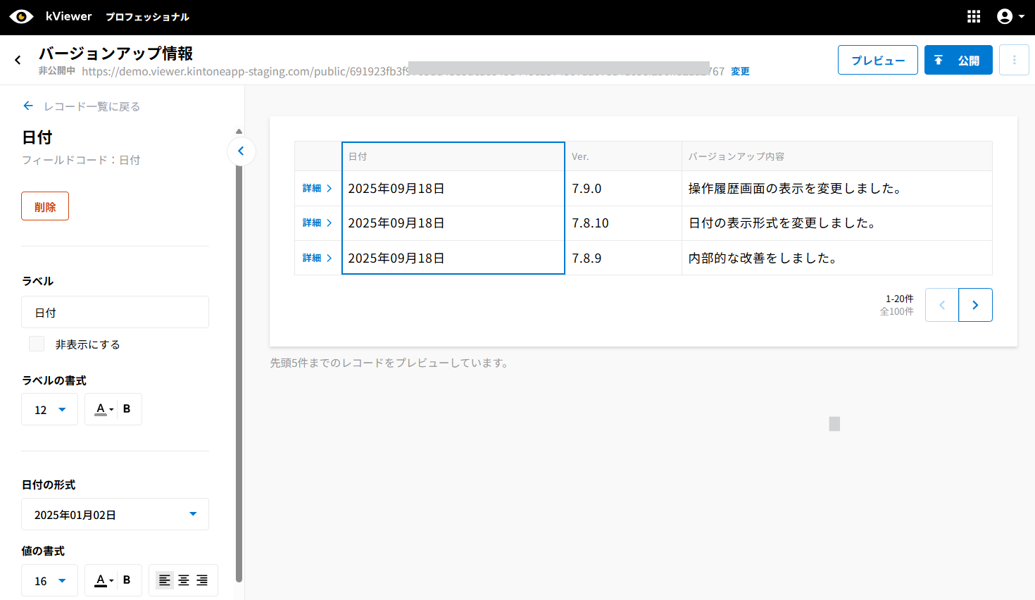 ※このページは、2024年9月18日(水)以降に作成された環境の場合、リストビューで「新しいバージョン」を選択した場合の操作ガイドです。リストビューで「従来のバージョン」を選択している場合、もしくはリストビュー以外のビューのレコード詳細画面を設定する場合はレコード一覧の各フィールドを設定するをご確認ください。