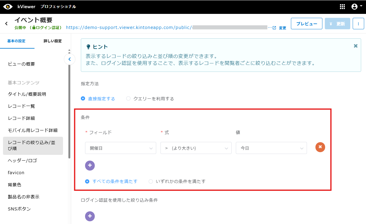 ログイン認証を使用した絞り込み条件を設定する