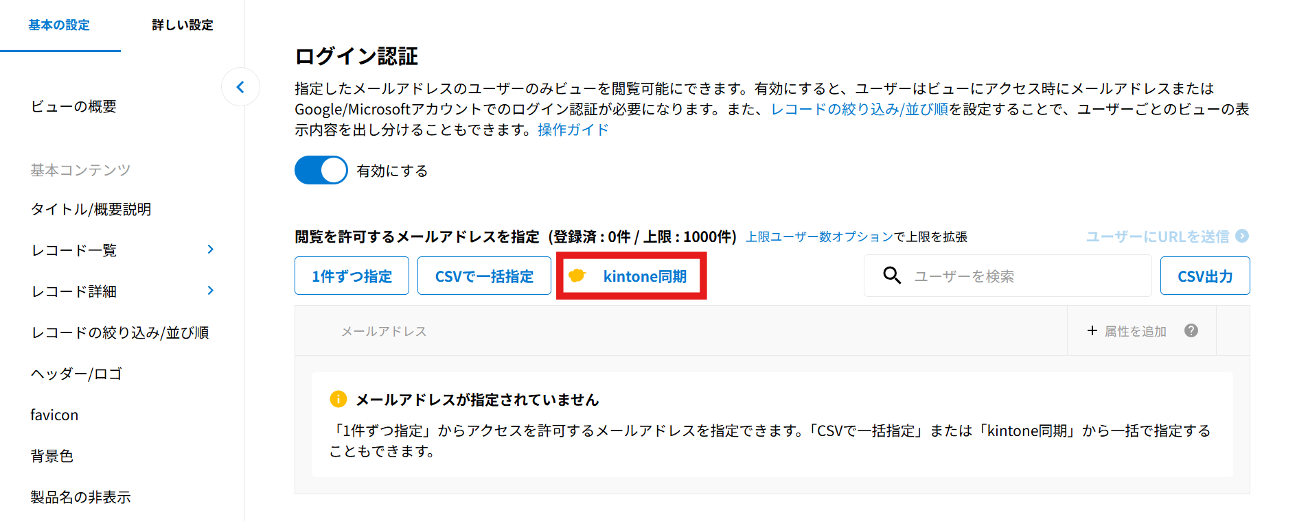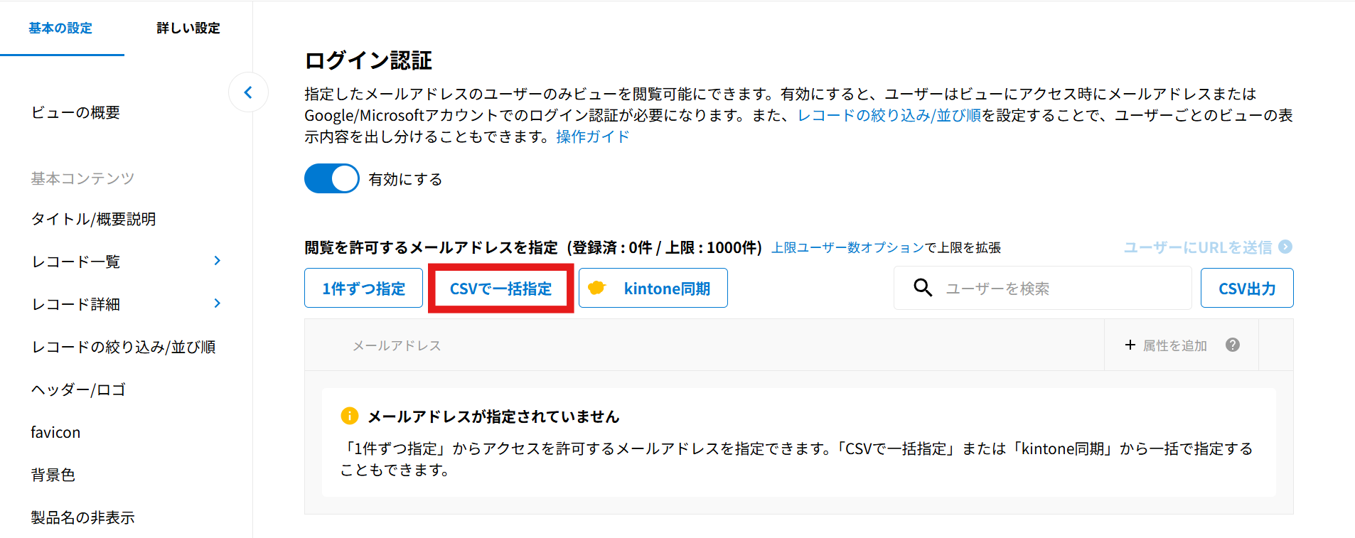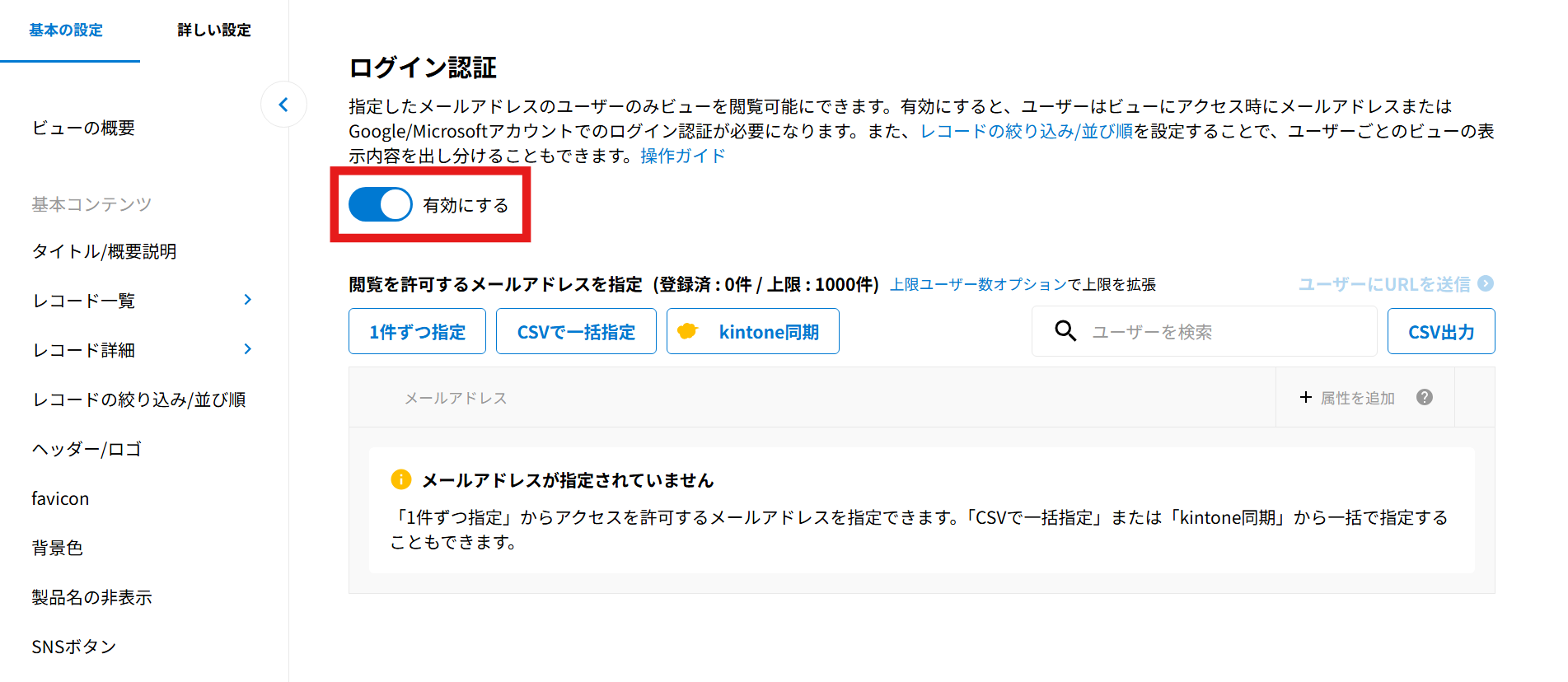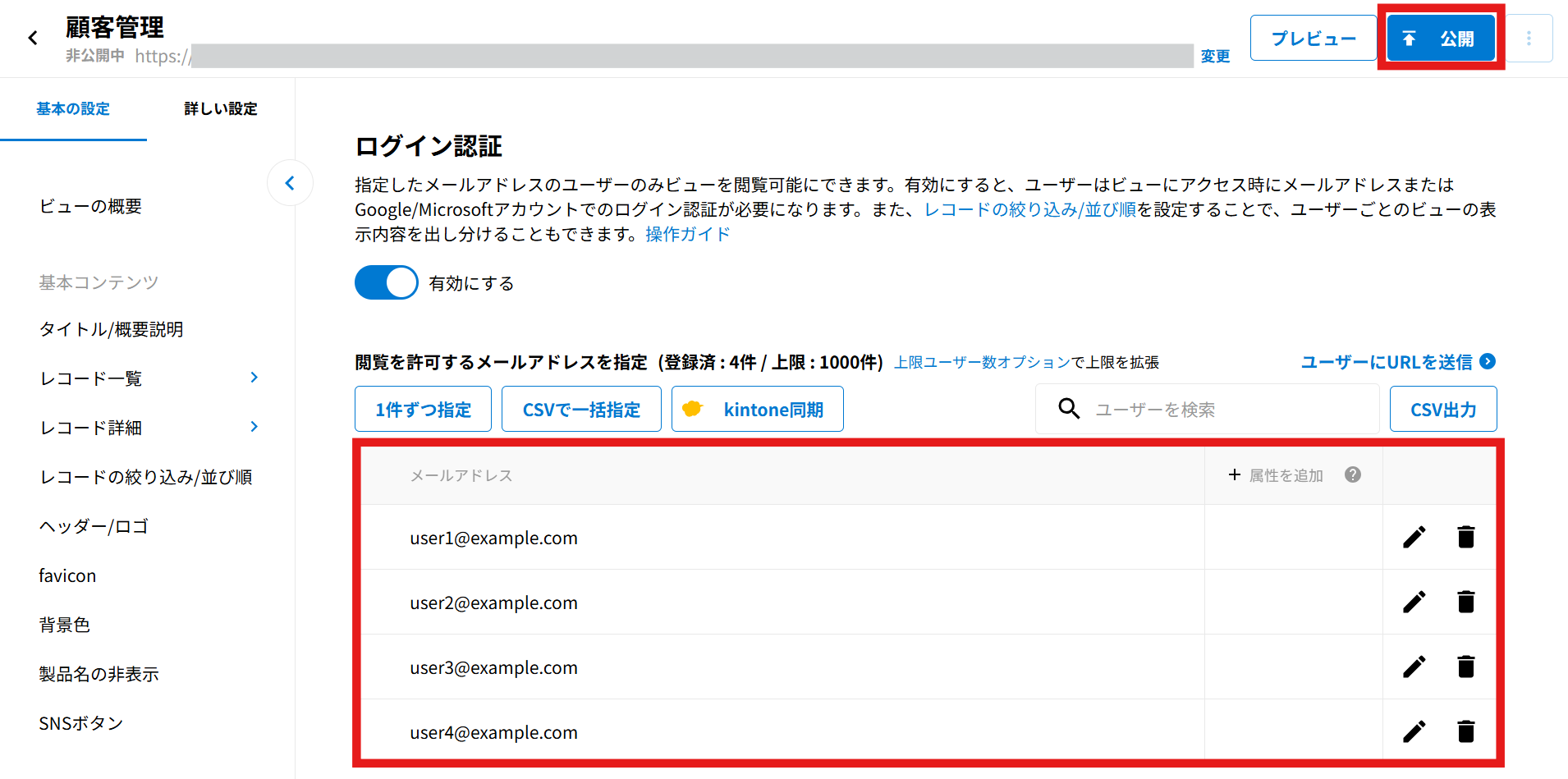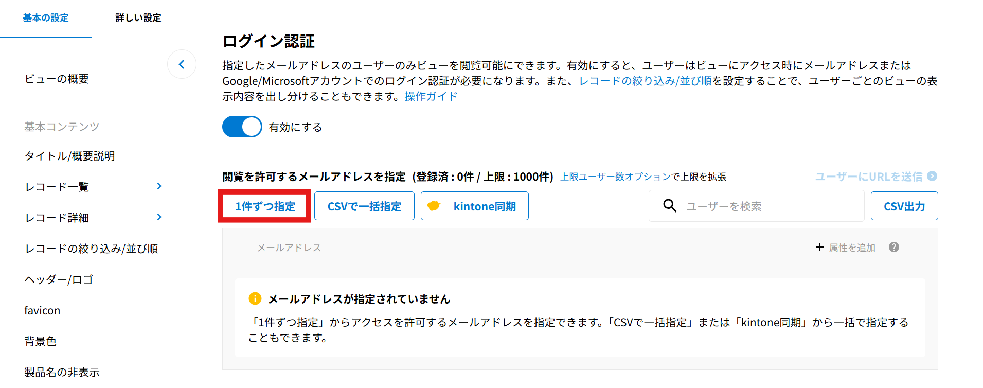 - ログイン認証で利用するメールアドレスは、1ビューあたり、プレミアムコースで50件、プロフェッショナルコースで1,000件まで登録が可能です。