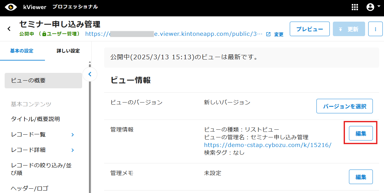 3.各ビューの「ビューの概要」> 管理情報 > に[編集]をクリックします。