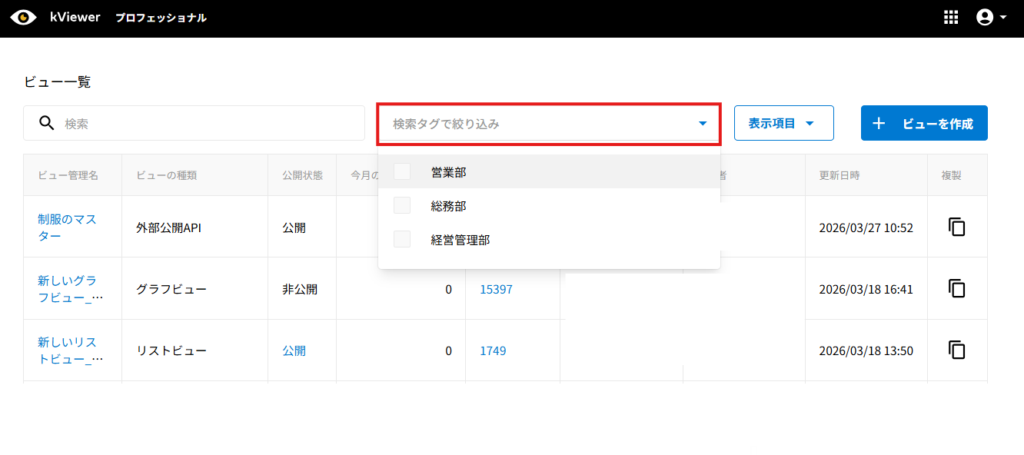 5.ビューの一覧画面上部にある「検索タグで絞り込み」より表示したいタグを選択します。