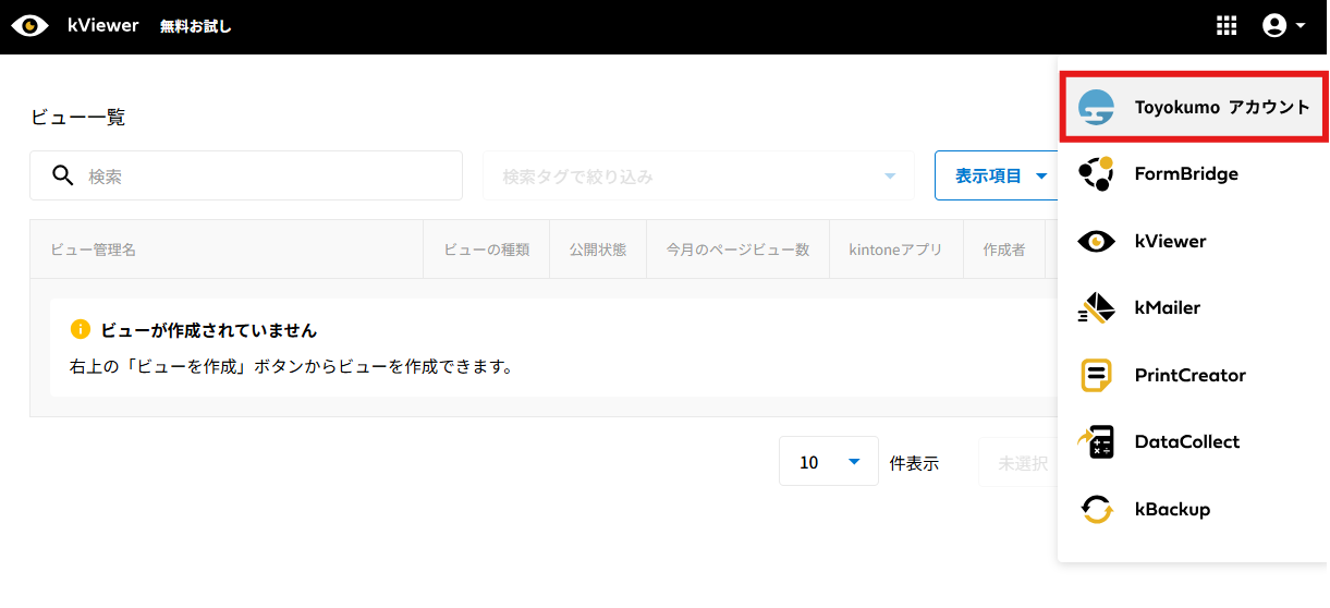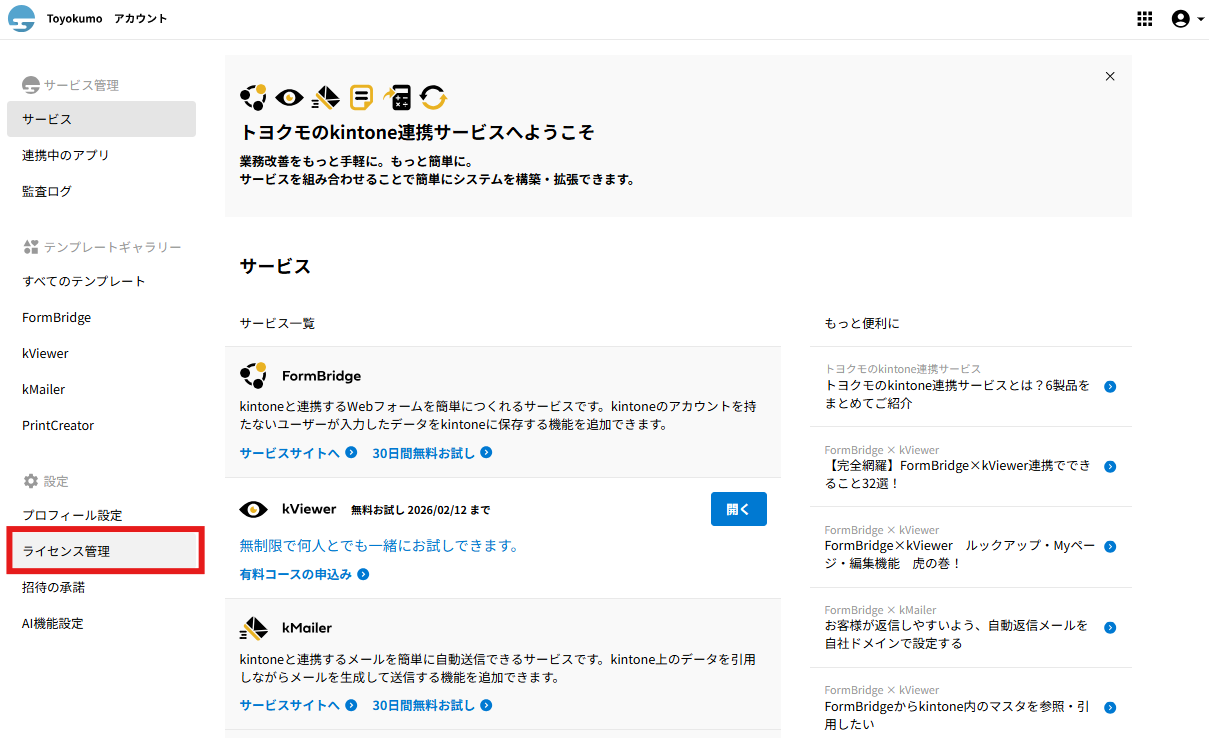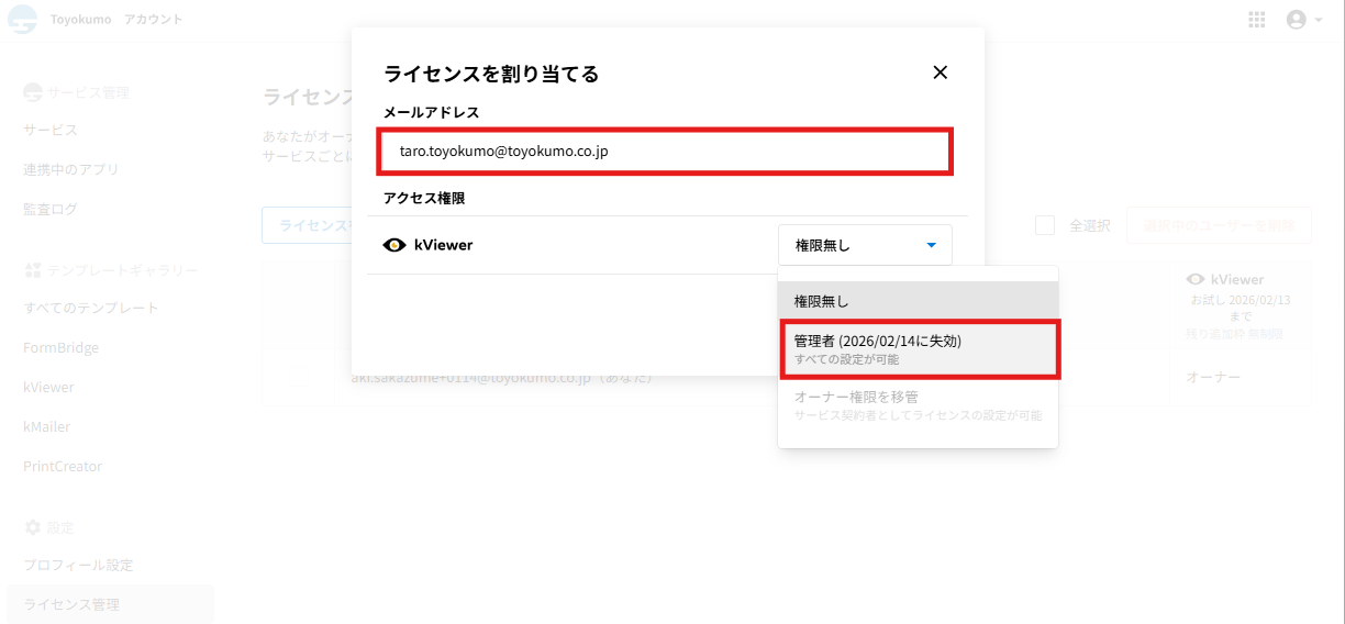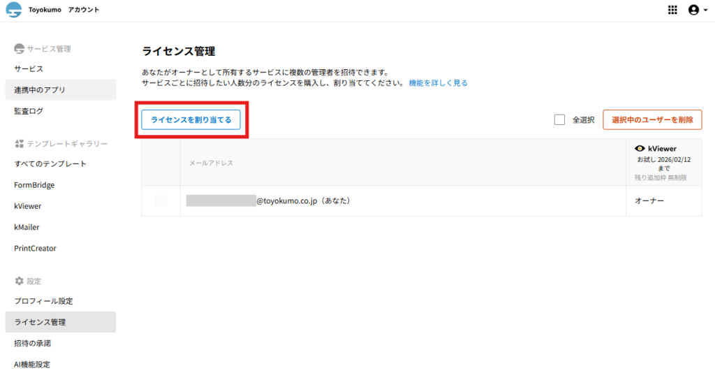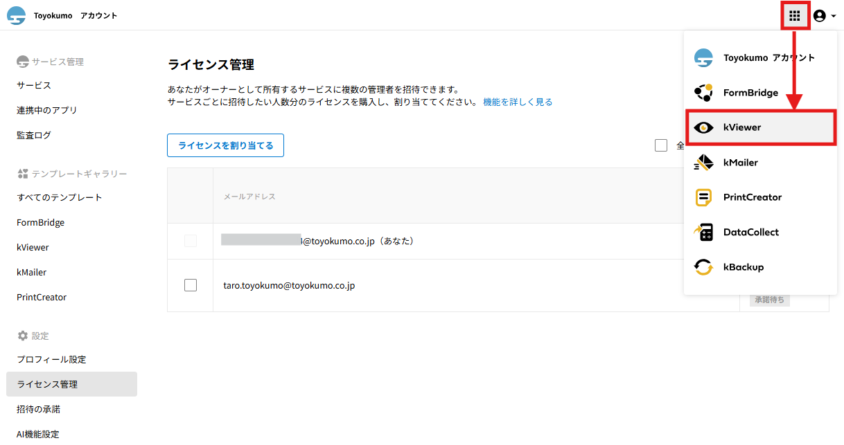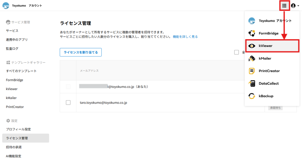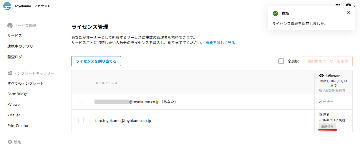 招待された側のユーザーの操作に関してはトヨクモkintone連携サービスの詳細を受け取った際の操作方法をご確認ください。