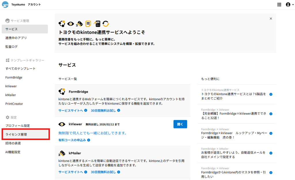 詳細は同一環境のトヨクモのkintone連携サービスにライセンスを追加して複数名で利用できますか?をご確認ください。