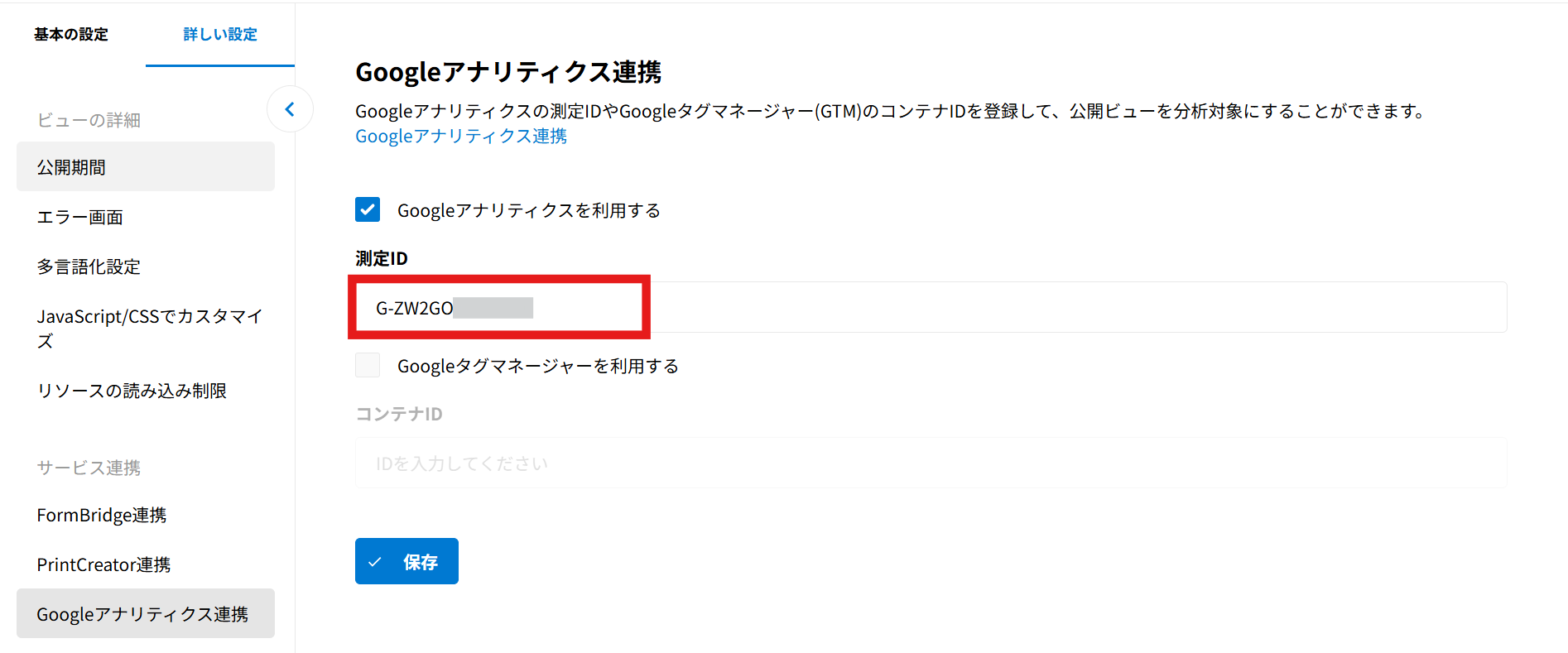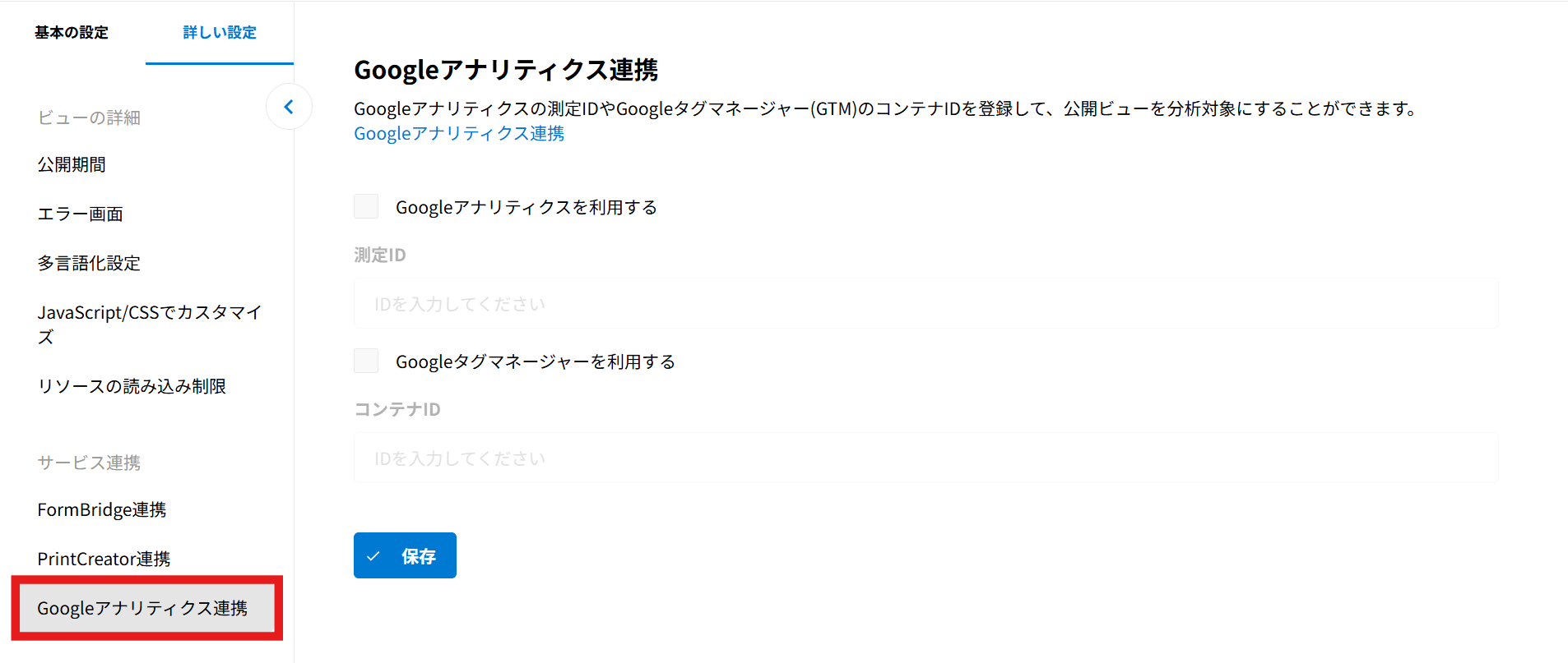 詳しい設定から『Googleアナリティクス』の設定に進みます。