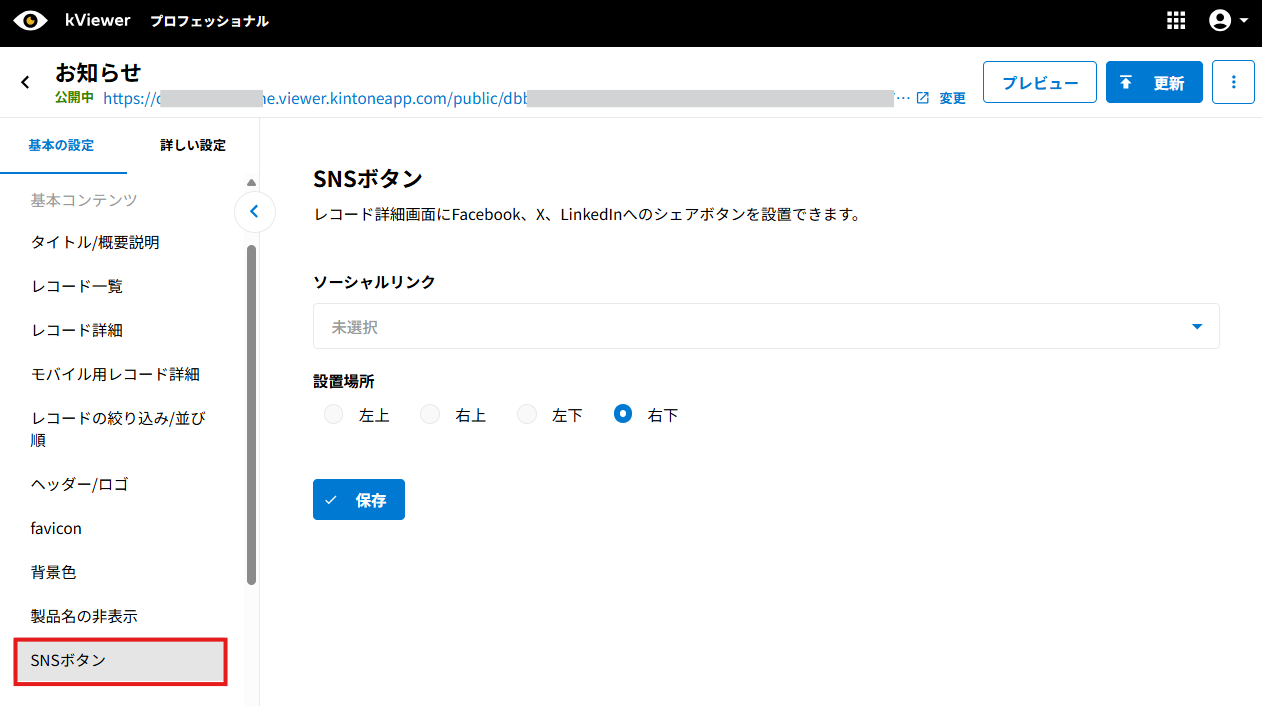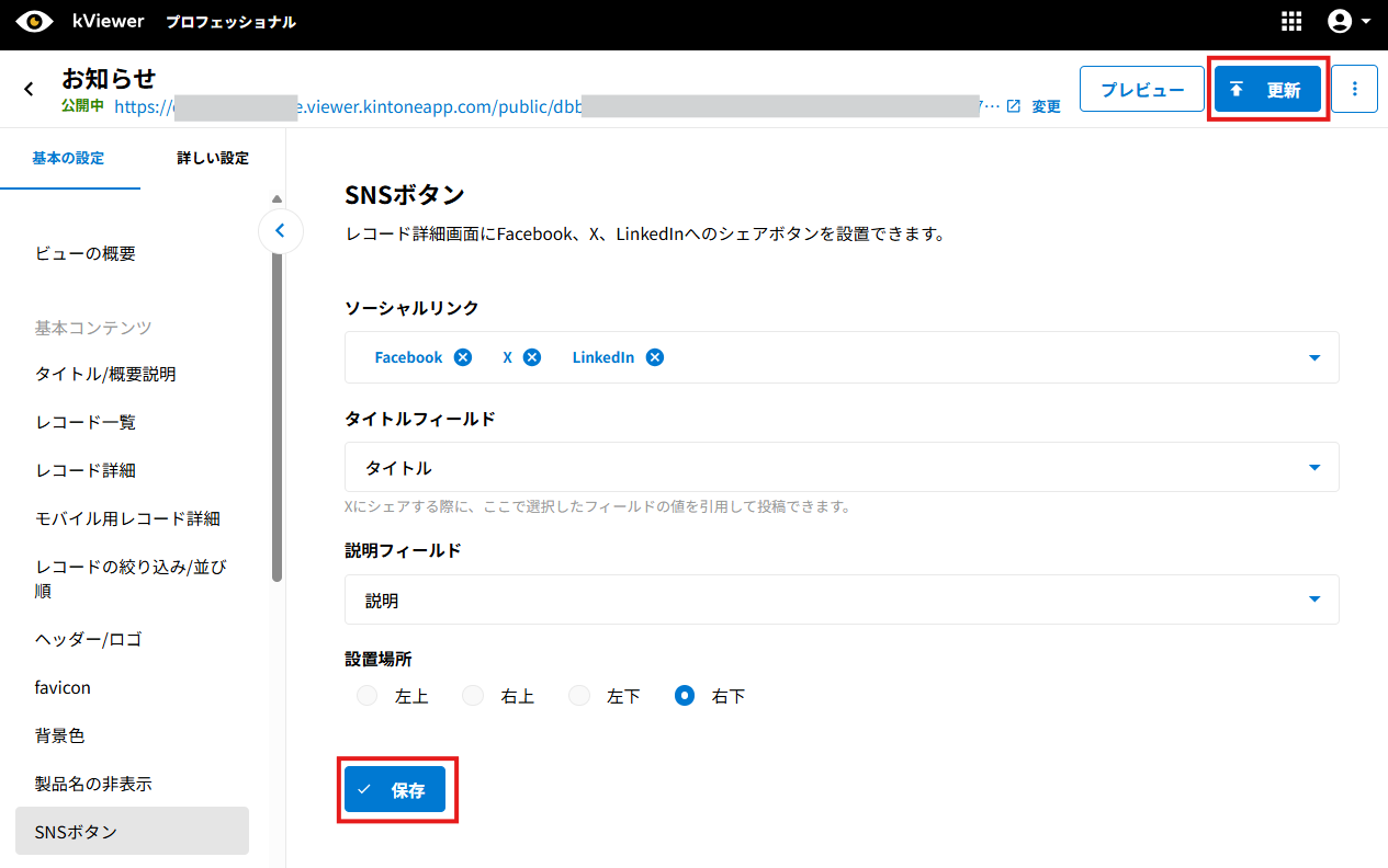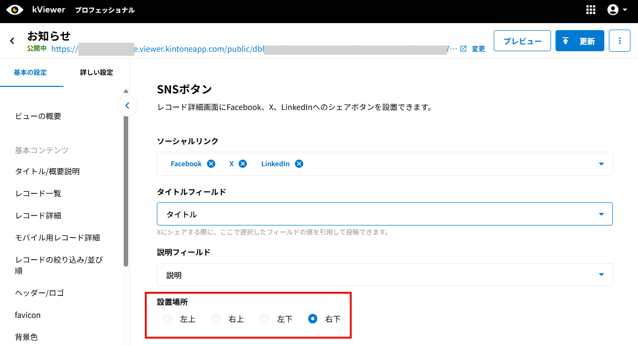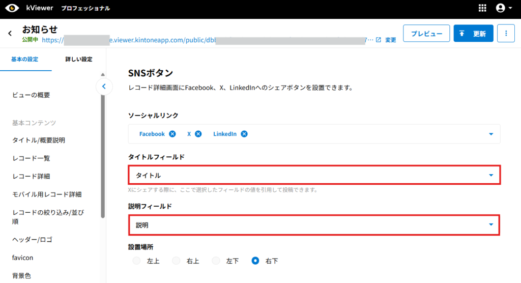 リストビューで「新しいバージョン」を選択している場合、Facebook、XのみSNSボタンの設定が可能です。3.Xはタイトルフィールド、