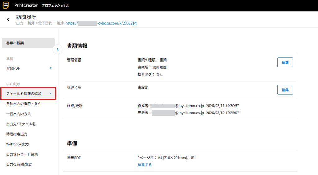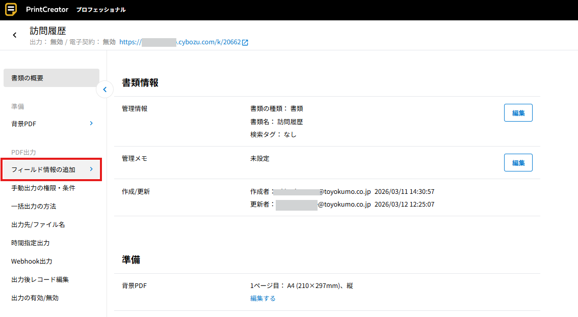 2.連携元アプリの、設定をされたい書類をクリックし、「フィールド情報の追加」の画面を開きます。
