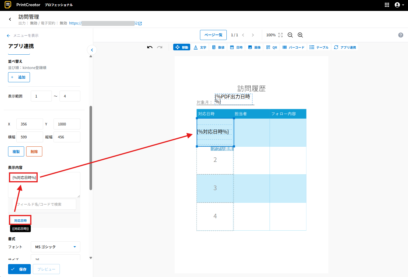 11.表示内容枠内に、出力したいフィールドを設定します。