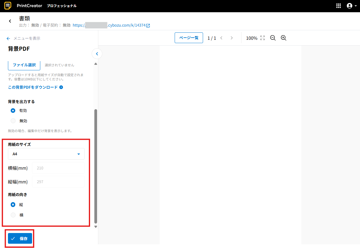 背景PDFを設定せずに、白紙の書類にレイアウトする場合は、「用紙のサイズ」と「用紙の向き」を設定した後、[保存]をクリックしてください。