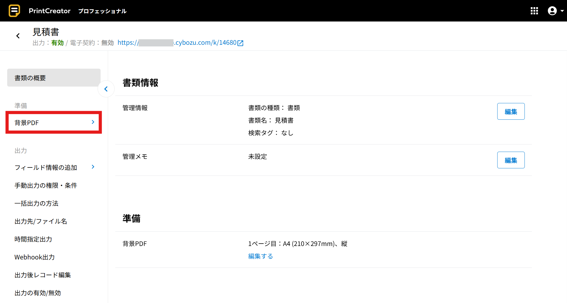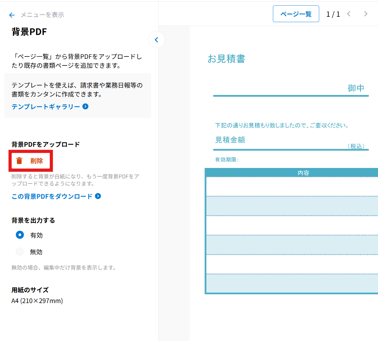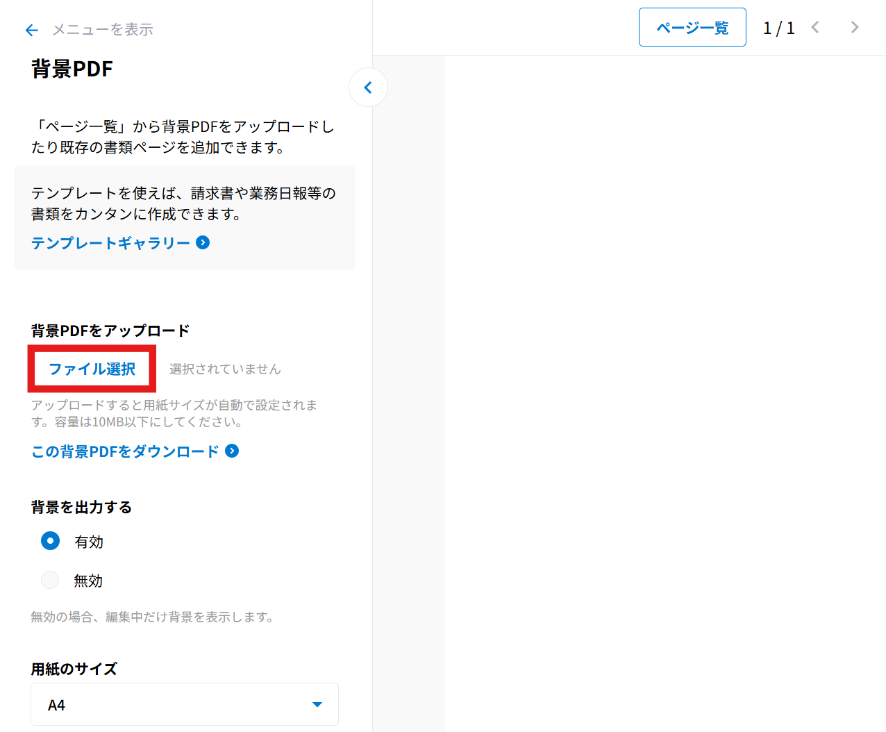 背景PDFとして設定できるファイルサイズの上限は10MBです。7.複数枚の書類にする場合は、[ページ一覧]から設定します。