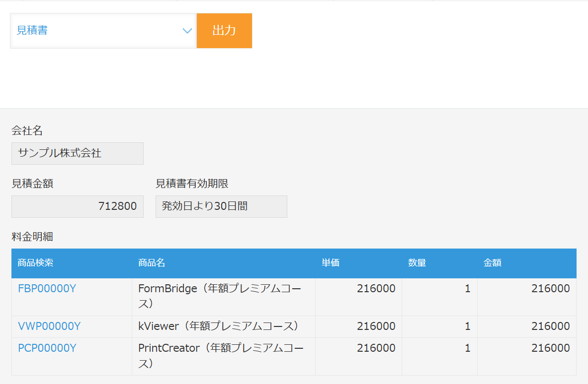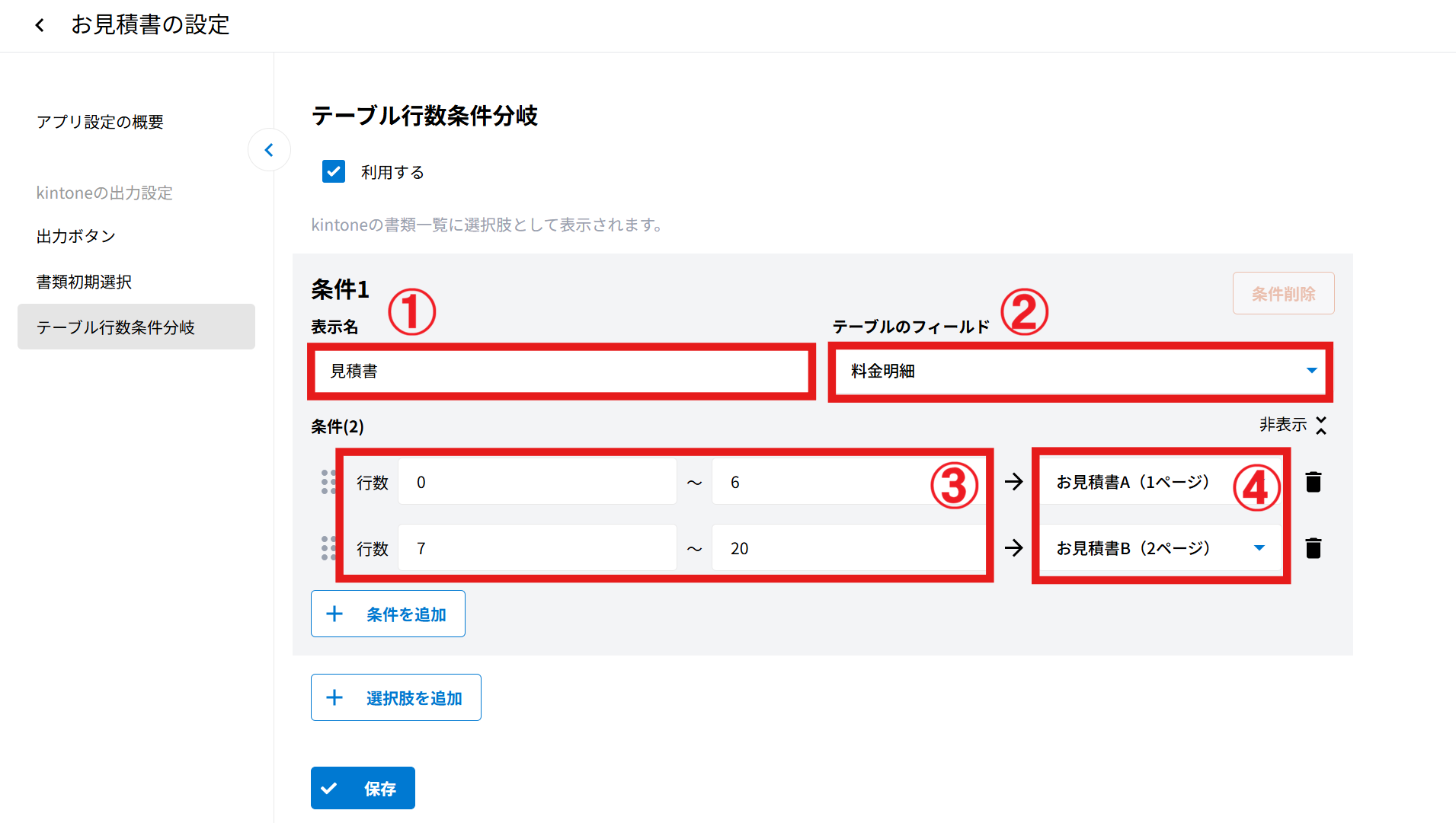 今回の場合、料金明細テーブルが0~6行の場合は1ページの書類(お見積書A)を、6~20行の場合は2ページの書類(お見積書B)を出力する設定です。