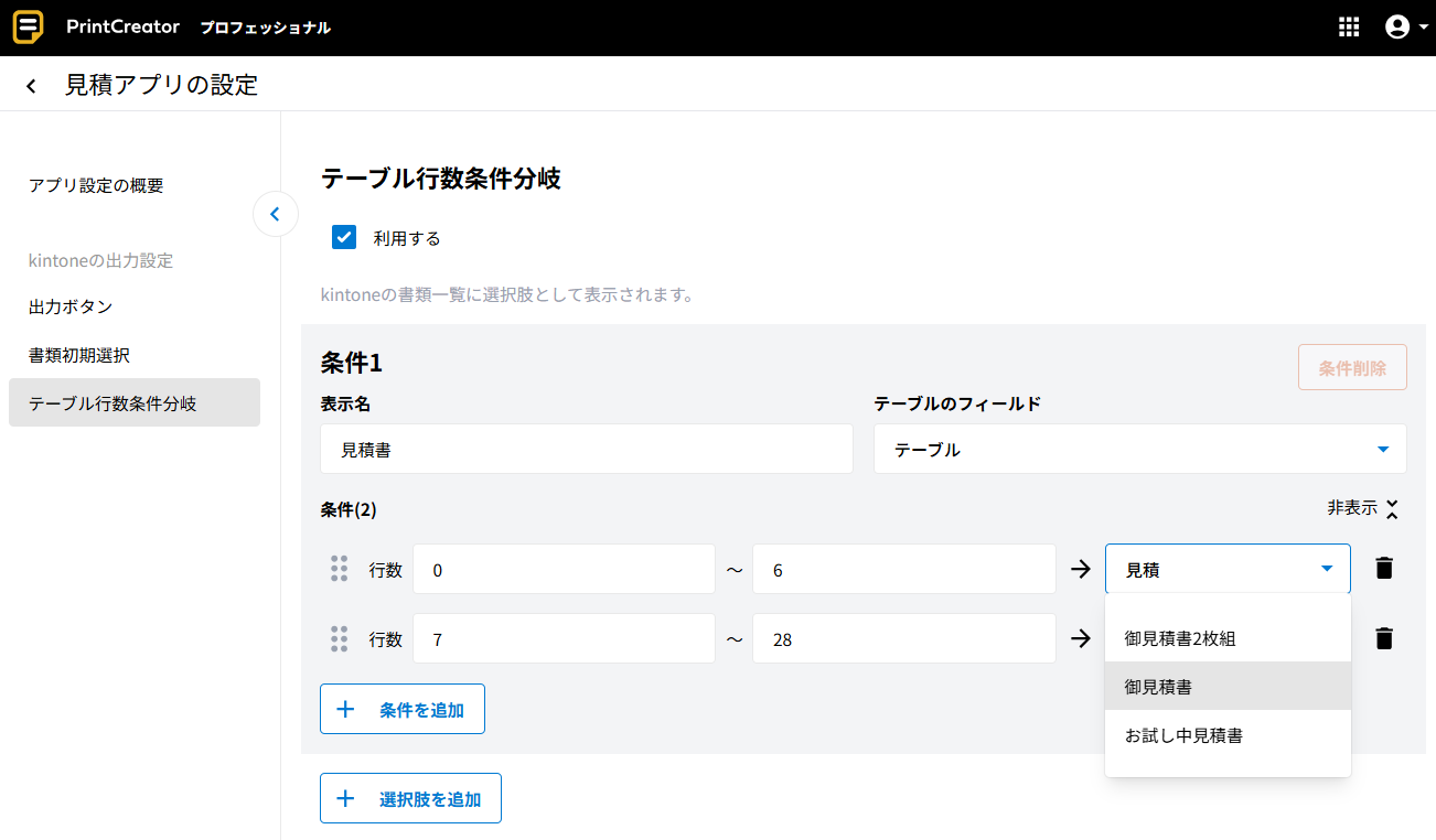 • テーブル行数条件分岐の「表示名」に設定された書類名は、kintoneアプリのプルダウン上で1番上に表示されます。