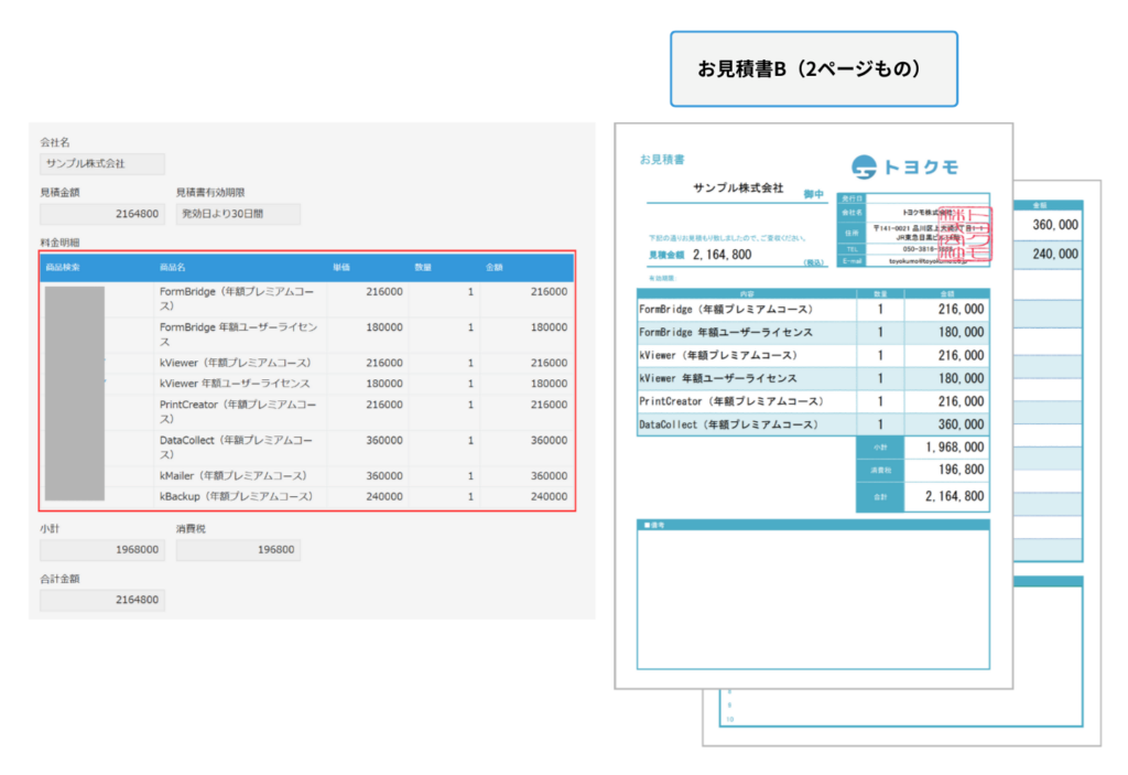 1ページに収まらないテーブル行数のレコードでは、あらかじめ設定した複数ページの書類を自動的に出力することができます。