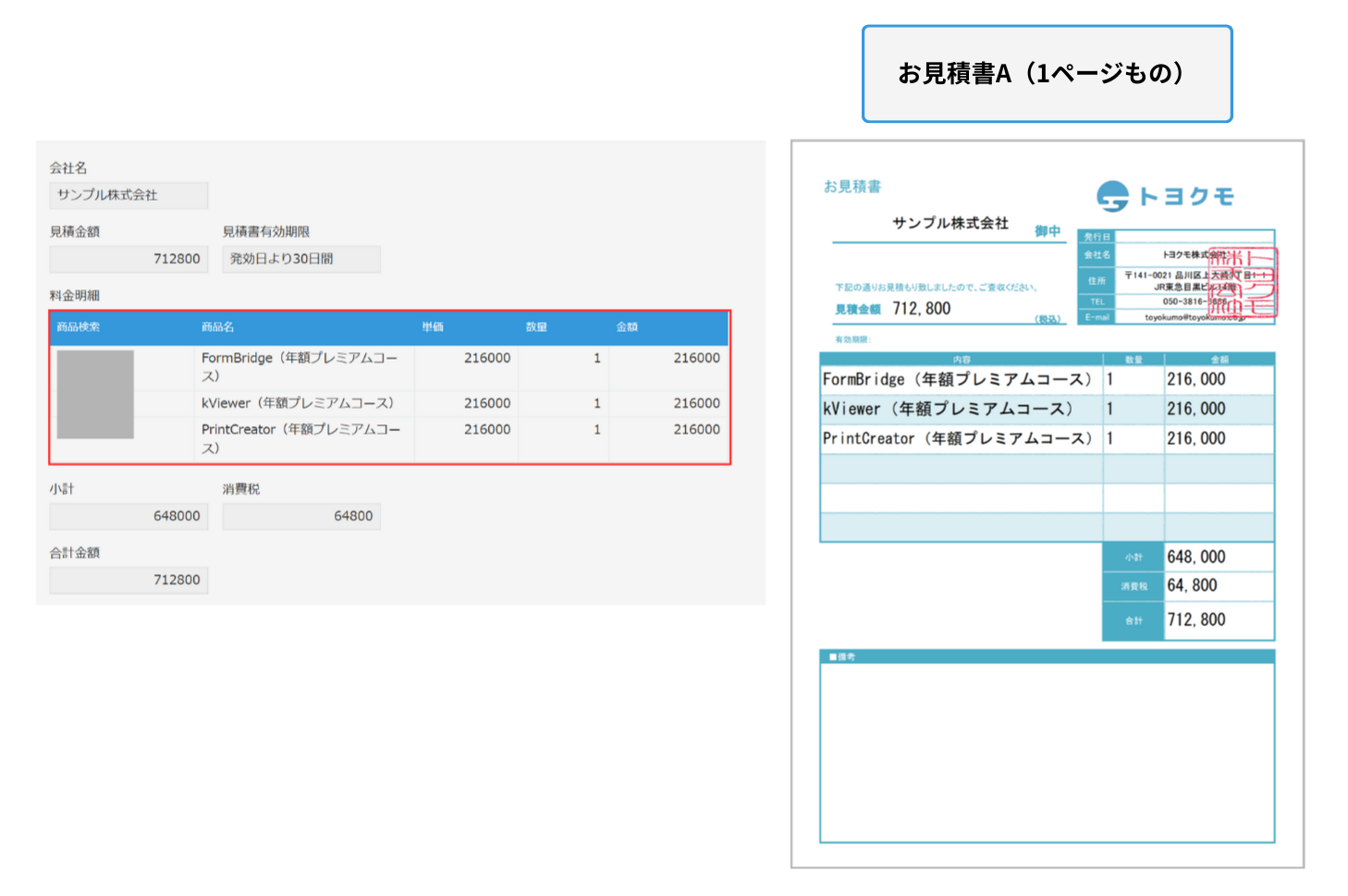 テーブルの最大行数が変動する書類(見積書、請求書等)の出力に適しています。