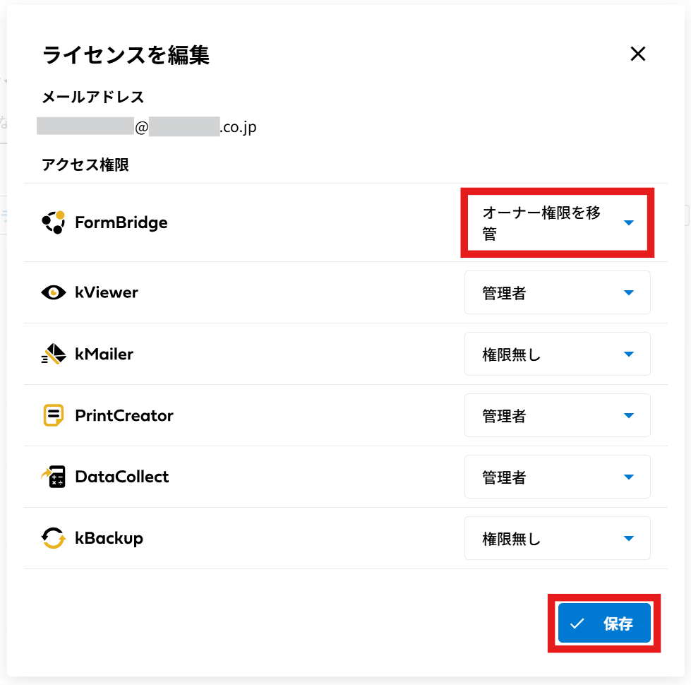 - オーナーのメールアドレスに関しましては、こちらの画面での変更は出来ません。各製品の管理画面上にて変更をお願いいたします。アカウント情報を変更する(FormBridgeのページを例示いたしますが、変更方法はどの製品も同様となります。)